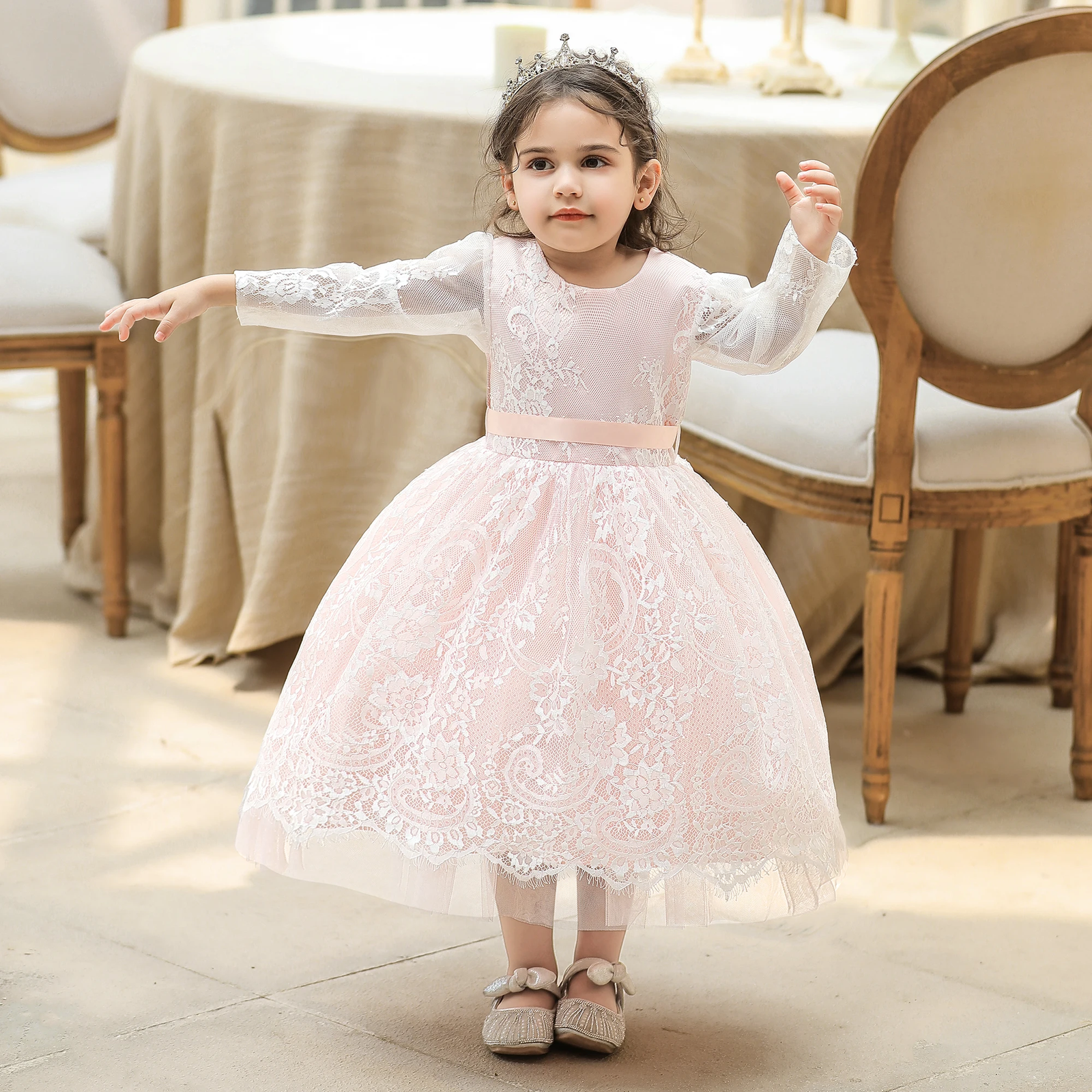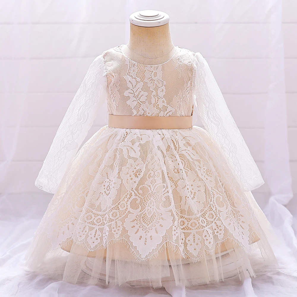 Vestido de fiesta color ivory/beige de encaje floral y manga larga. Tiene una falda voluminosa de tul y una faja lisa en la cintura. Es un diseño elegante, delicado y cuenta con forro de algodón para mayor comodidad.