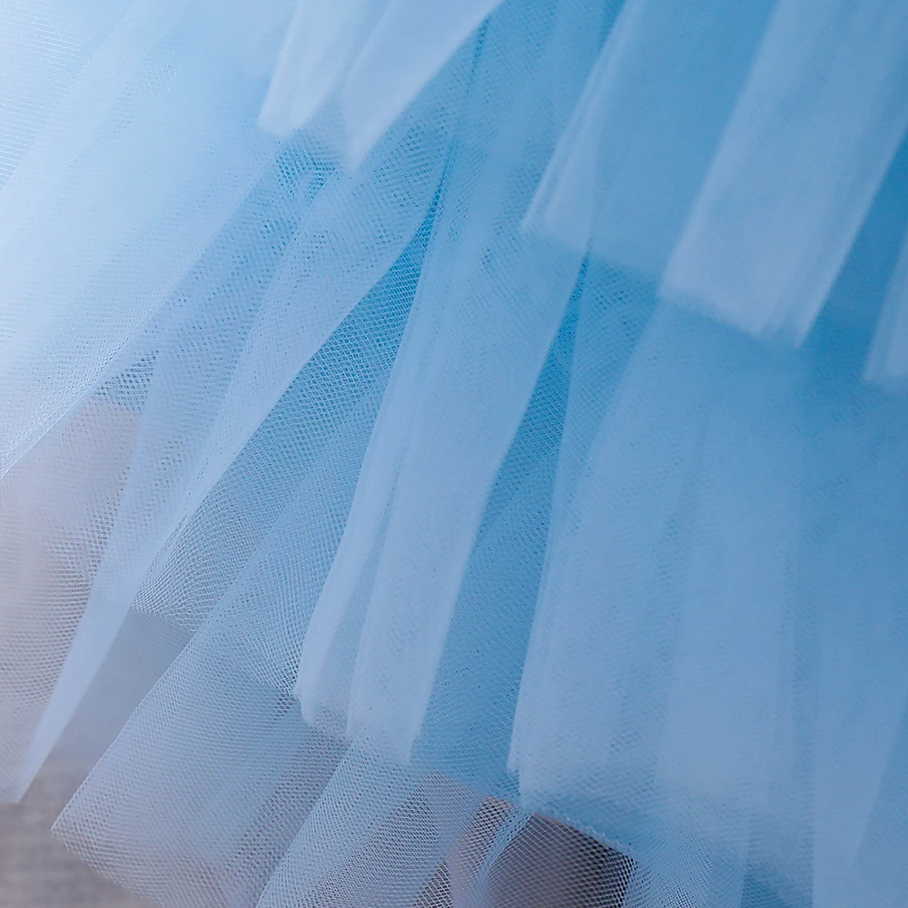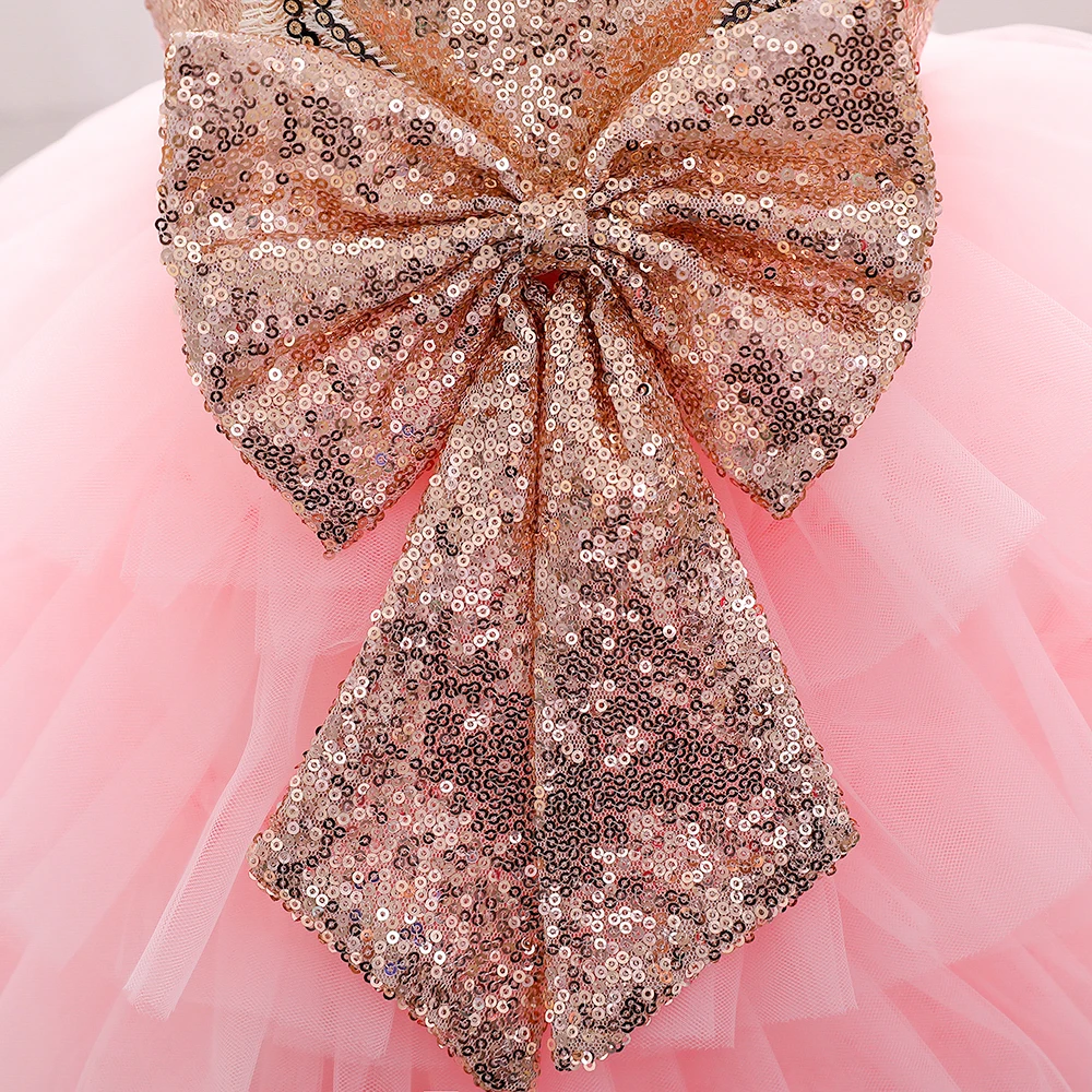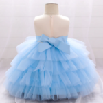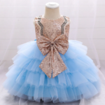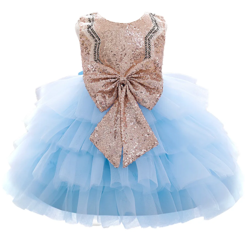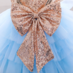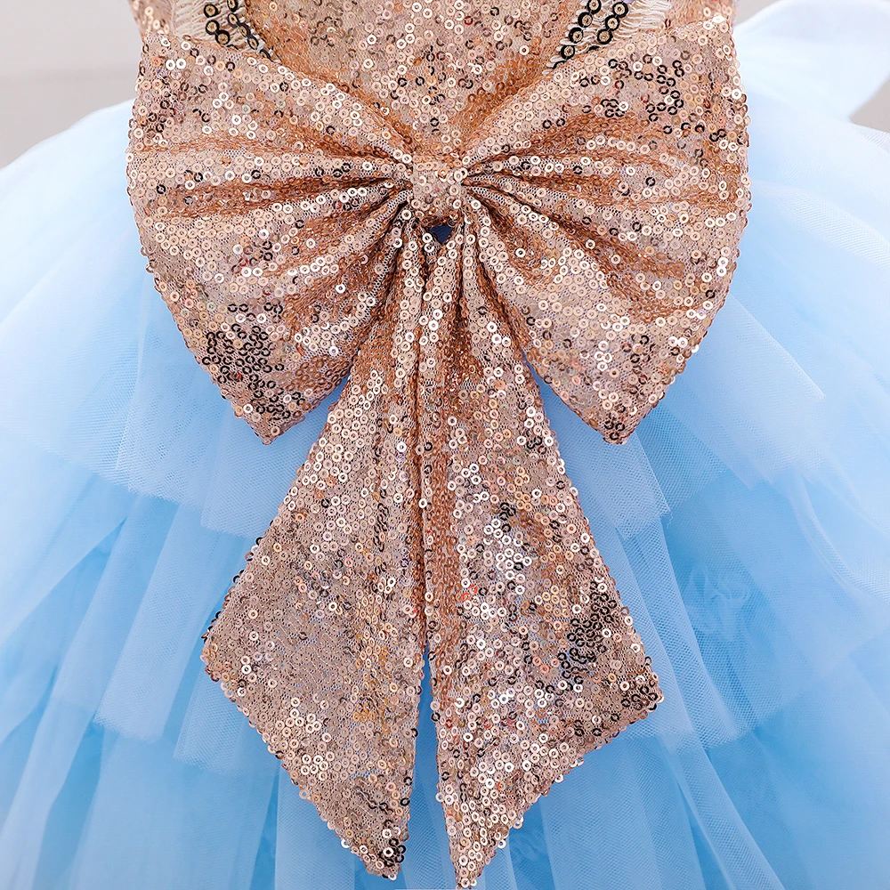 Elegante diseño con un frente bañado en lentejuelas doradas de alto brillo y una falda de tul celeste con volantes escalonados 👗✨. El gran lazo central añade un toque de sofisticación clásica, ideal para eventos exclusivos y celebraciones especiales 🎀🌟