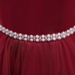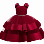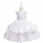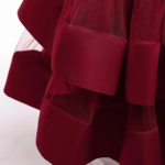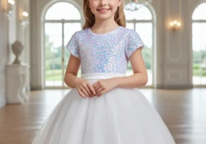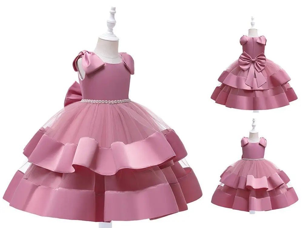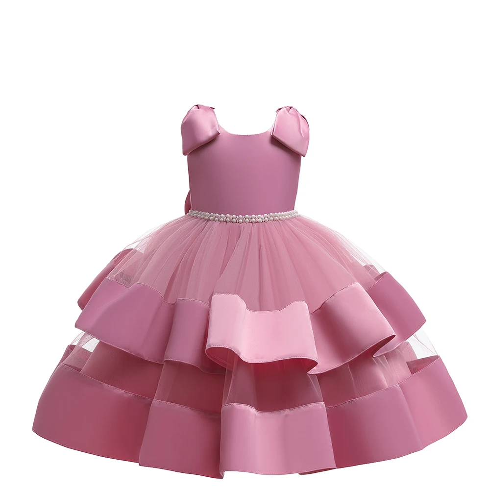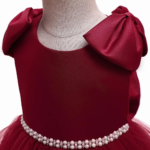 El vestido elegante, con moñas en los hombros, satinado, con un diseño sin mangas y un gran lazo en la parte trasera. Cuenta con una falda larga y voluminosa con capas de tul y detalles de cuentas o pedrería en la cintura, ideal para ocasiones especiales.🎀👗✨